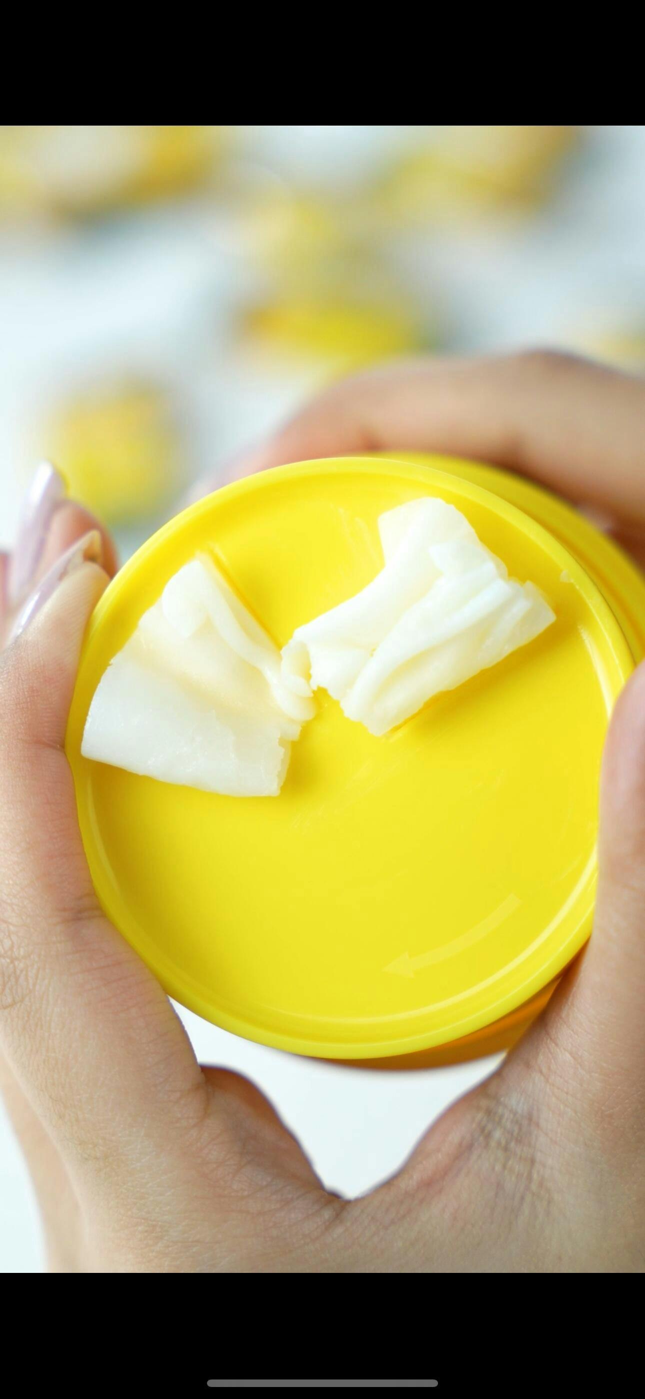 Yellow balm makeup removing container labeled 'Mango Swirl' on a yellow background