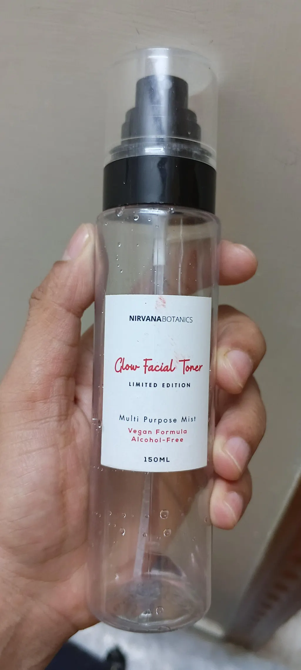Facial toner bottle with 'Nirvana Formula Glow' on a purple water background
