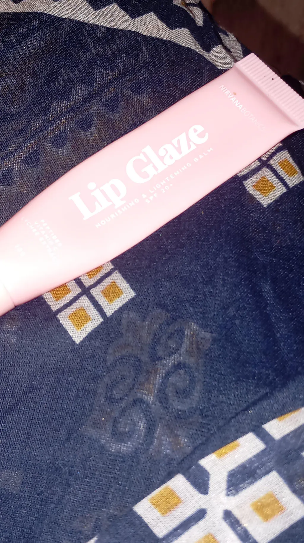 Lip glaze tube with caramel-themed packaging on a beige background